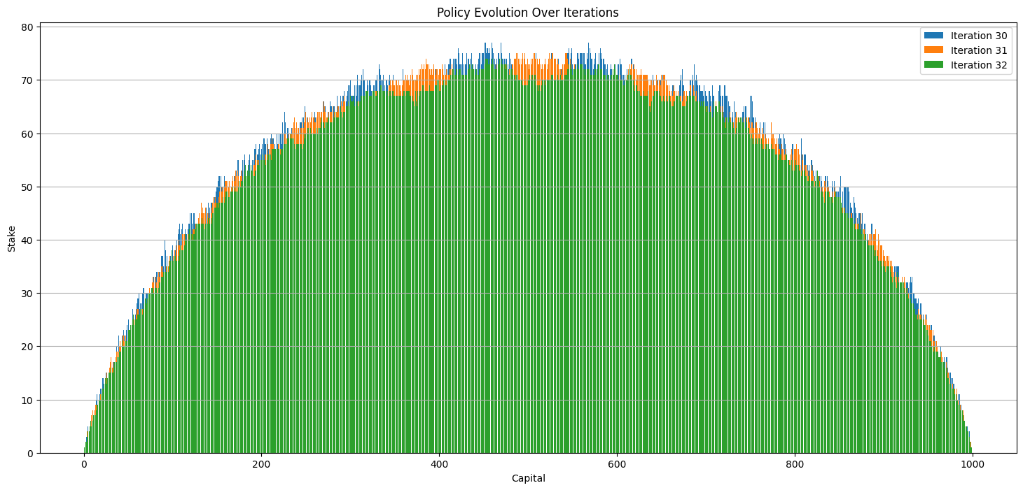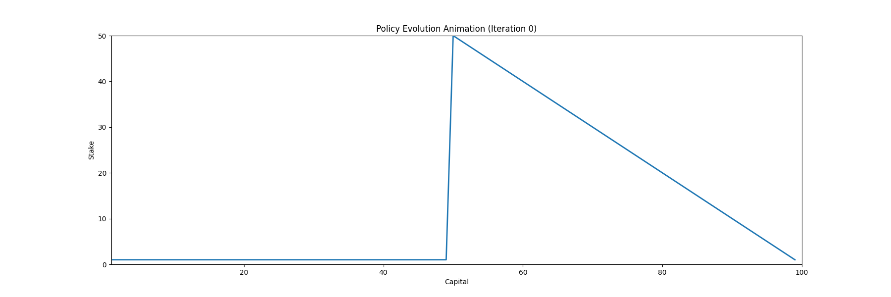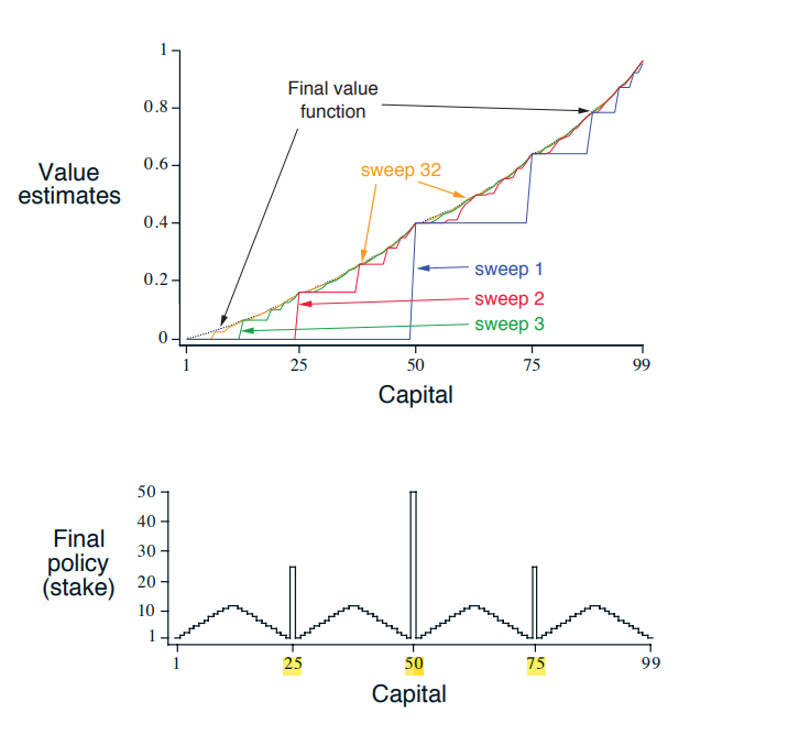A Gambler has the opportunity to make bets on the outcomes of a sequence of coin flips. If the coin comes up heads, he wins as many dollars as he has staked on that flip; if it is tails, he loses his stake. The game ends when the gambler wins by reaching his goal of $100, or loses by running out of money. On each flip, the gambler must decide what portion of his capital to stake, in integer numbers of dollars. This problem can be formulated as an undiscounted, episodic, finite MDP. A policy is a mapping from levels of capital to stakes. The optimal policy maximizes the probability of reaching the goal. Let ph denote the probability of the coin coming up heads. If ph is known, then the entire problem is known and it can be solved, for instance, by value iteration. Figure 4.3 shows the change in the value function over successive sweeps of value iteration, and the final policy found, for the case of ph = 0.4.